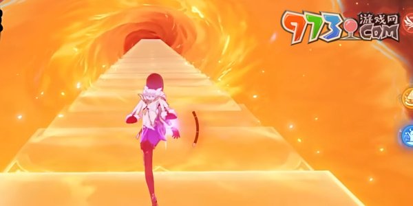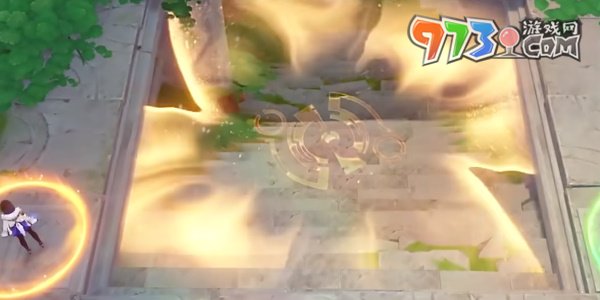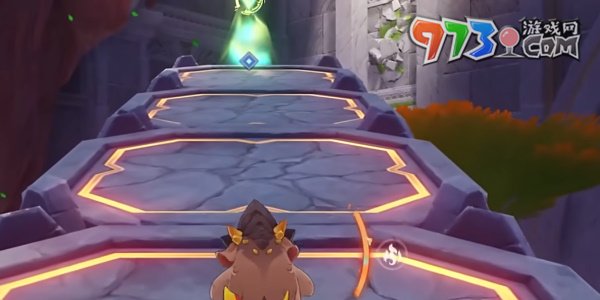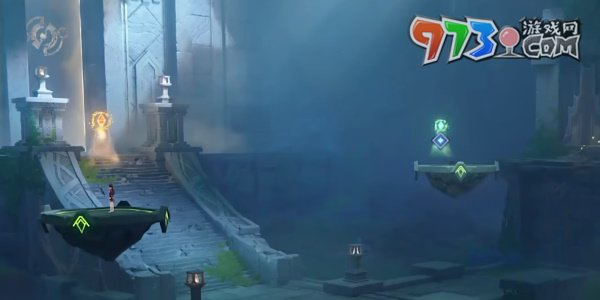 4、来到遗迹深处,让角色和小龙站在不同的光圈中打开屏障穿过廊道。