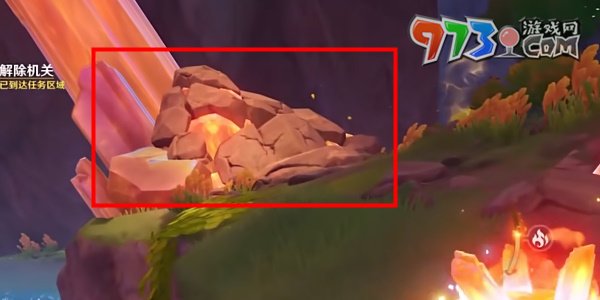 5、操作小龙进入遗迹深处探索,来到大石柱前,击碎石堆出现震颤晶石。