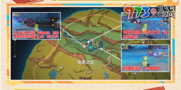 4、穿过山洞来到柴薪之丘北边,完成如下图标记的三处的解密,再次出现黑色的图腾巨石,触碰后进入秘境挑战。