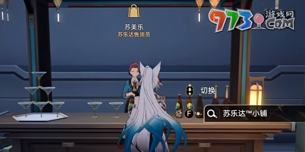 3、进入房间后来到苏乐达小摊的位置找到NPC苏美乐,与其对话。