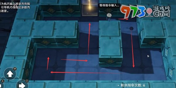 3、为机巧输入指定的移动方向,在限定步数内逃离迷宫即可,正确答案是右→下→左→上→右→上。