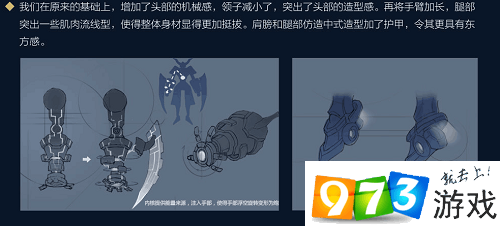 我们在原来的基础上,增加了头部的机械感,领子减小了.突出了头部的造型感。再将手臂加长,腿部突出一些肌肉流线型,使得整体身材显得更加挺拔。肩膀和腿部仿造中式造型加了护甲,令其更具有东方感。