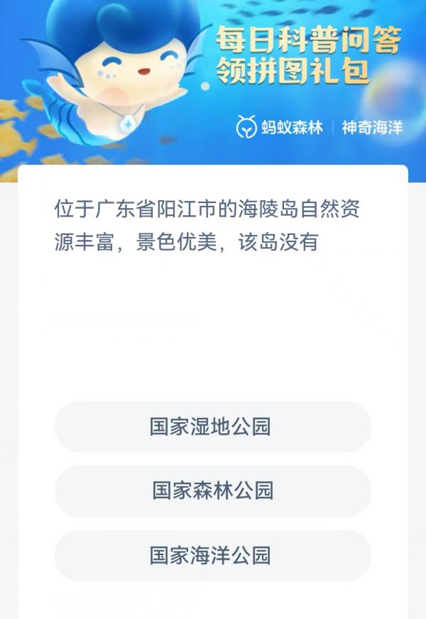 位于广东省阳江市的海陵岛自然资源丰富景色优美该岛没有,在今天神奇海洋的问题中询问到关于广东省阳江市陵岛自然资源丰富景色优美的问题,不少小伙伴看见该提问之后纷纷开始犯了难不知道具体该怎么去回答,那么其中的答案到底又是什么呢,下面973游戏网小编为大家带来关于《支付宝》6月28日神奇海洋科普问答答案分享,一起来看看吧。