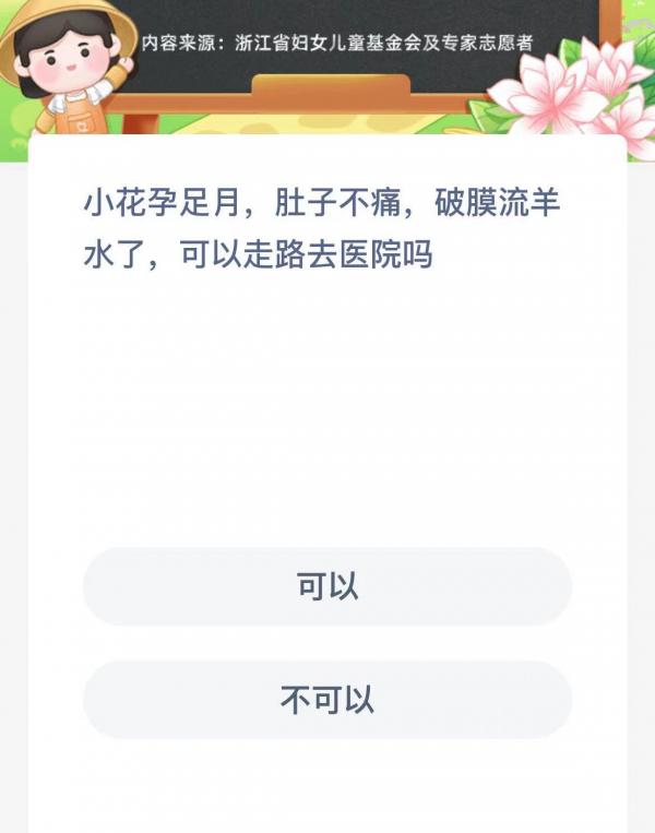 小花孕足月,肚子不痛,破膜流羊水了,可以走路去医院吗?今天的这道题目相信大家看见之后心中一定都是有着属于自己的答案的,接下来就由973游戏网小编为大家带来《支付宝》蚂蚁新村小课堂9月3日日每日一题答案分享,不确定的用户赶快一起来看看吧。