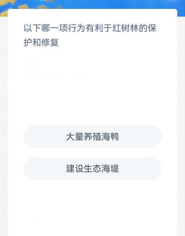 红树林保护的问题上不仅是需要大家共同进行的保护,还需要专业的人士对于进行有效的修复从而才能更好的对于红树林进行呵护,那么在今天的题目中哪一种选项从而才能更好的利于保护以及修复呢,对此小编为大家所带来详细具体的内容介绍一起了解下。