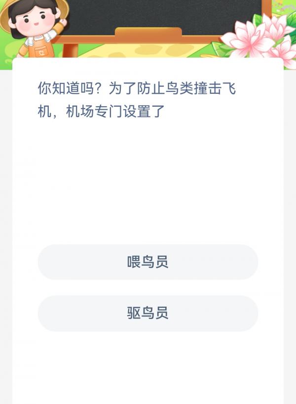 不知道在机场周边是很难会看有鸟儿的踪迹的,其实这还是和机场飞机起飞是有着密不可分的关系的,并且还为其专门设置一个部门不少很多小伙伴都对此都不是特别的清楚的,那在该题目中大家又该怎么进行回答呢,一起了解下。