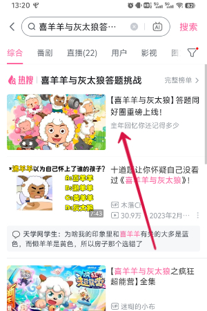 2、点击搜索,在搜索内容中点击热榜的【喜羊羊与灰太狼】答题同好圈重磅上线,点击进入到答题界面;